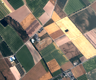 When we apply the LCAI equation to hyperspectral imagery, areas that contain large amounts of dead plant matter (and therefore lots of cellulose & lignin without chlorophyll) will show up as positive values. Healthy vegetation and dirt will present as negative values. This can be observed in the below image, where fields containing large amounts of dead plant material show up as bright green, and healthy fields & dirt present as red & yellow.
