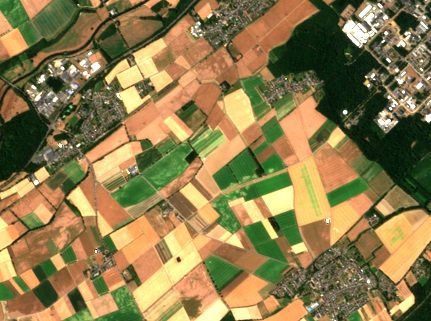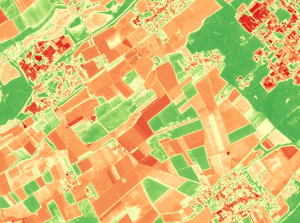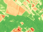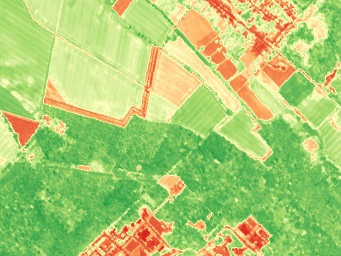 When comparing RENDVI to VREI2 in the above image, a number of things can be discerned. The field in the top-right is significantly greener than other fields when viewed in the VREI2 index. This field is growing maize, whereas fields in the left of the image are growing wheat and sugar beets (according to the EU 2018 crop map). Areas of more vigourous growth can also be identified in the forest at the bottom of the image in VREI2.