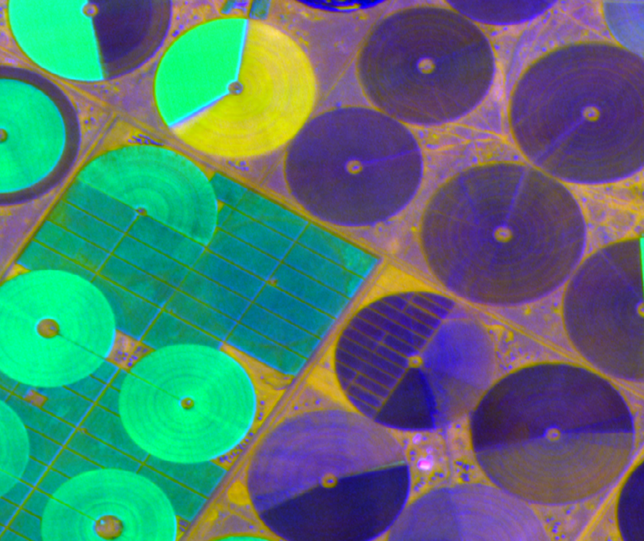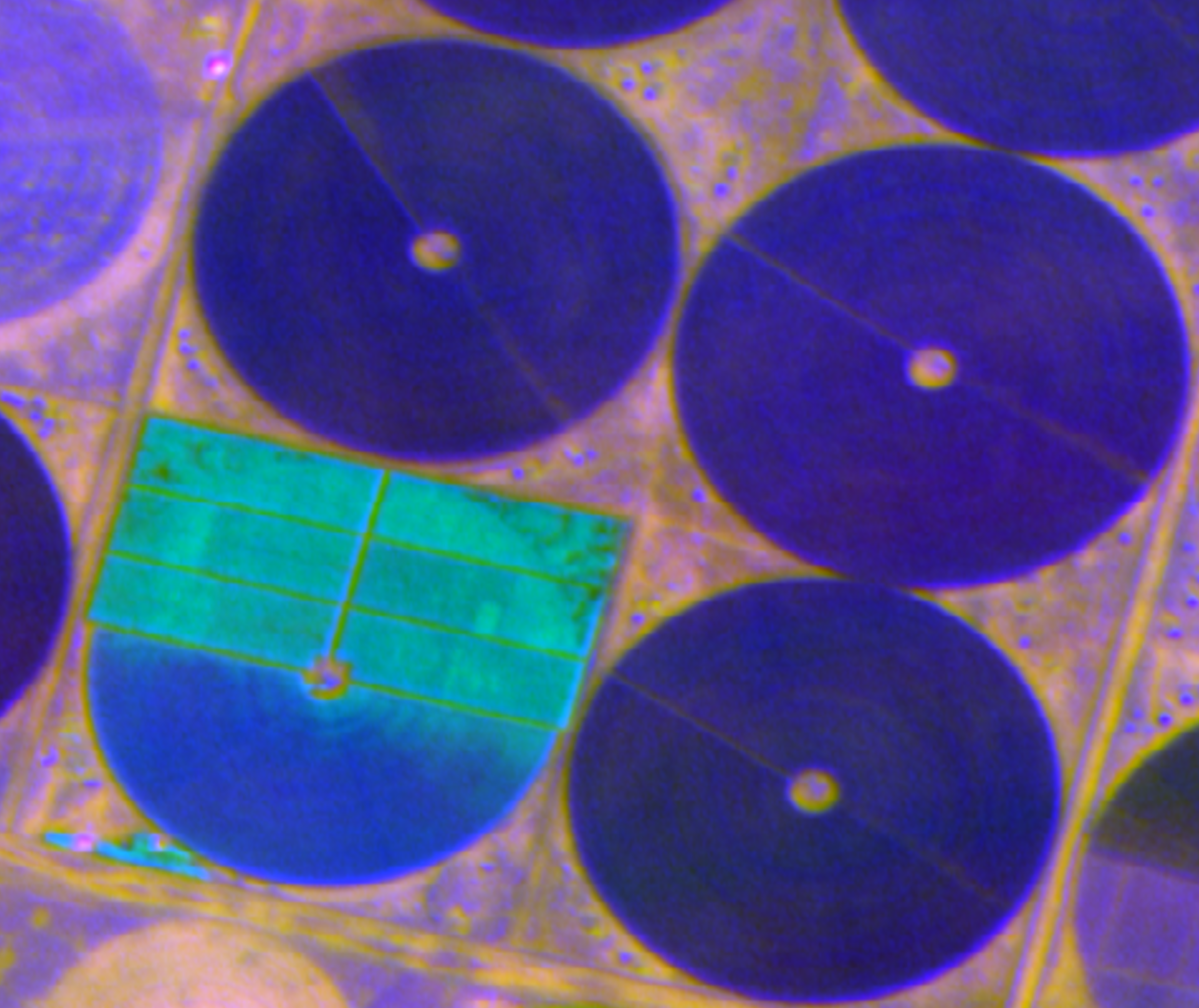 We can see a clear differentiation between not just the irrigated plots (blue), non-irrigated plots (yellow), and the empty plots (green), but the buildings showing up as smaller rectangular areas (red) within the plots at the top.